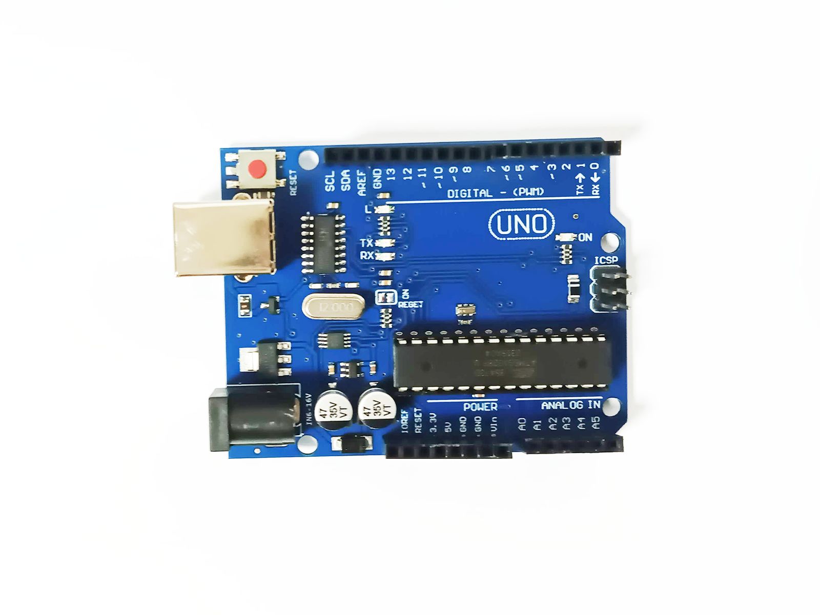 Uno R3 CH340G ATmega328p Development Board is the low-cost version of the popular UNO R3 Arduino. It is assembled with the CH340 USB to Serial converter chip, instead of using an Atmega16U2 chip.